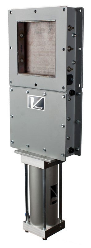 Válvula de guillotina para la retención de producto por encima o por debajo de tolvas/silos de alimentación por gravedad